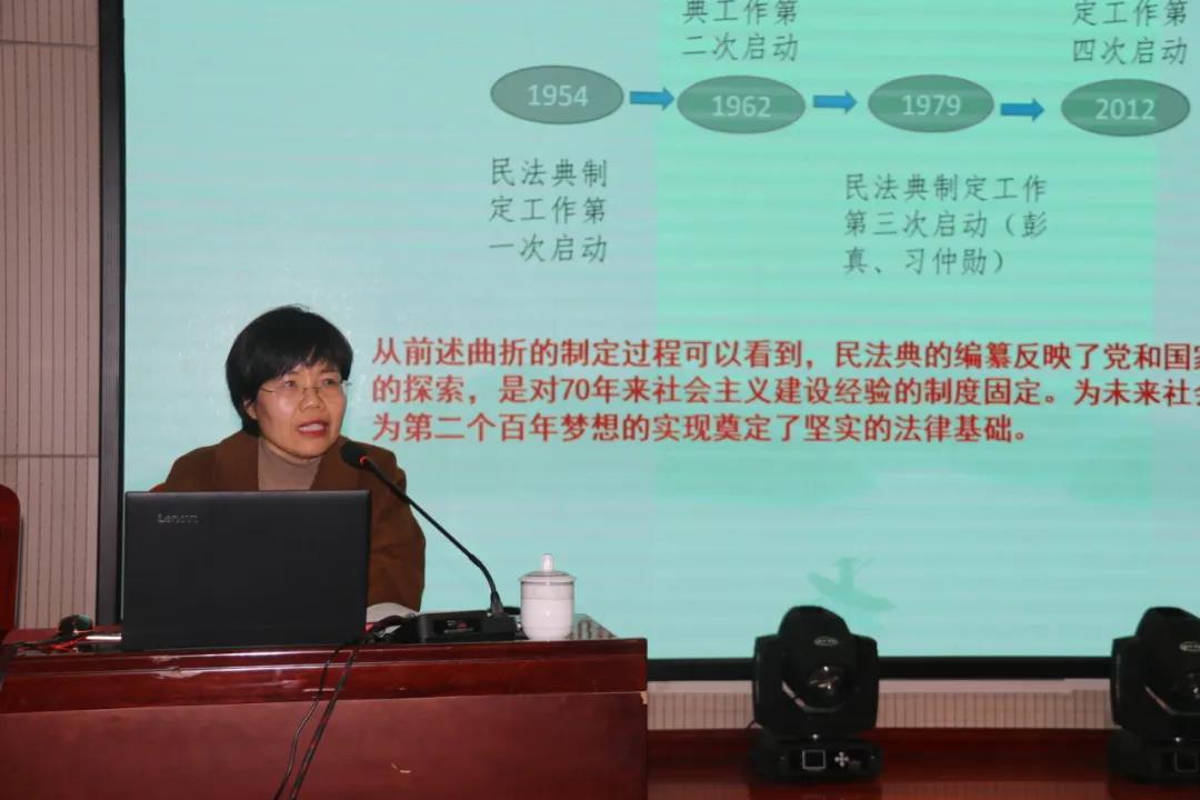 为深入贯彻习近平总书记关于学习贯彻民法典的重要讲话精神,学习好、推进好、保障好民法典的教学和实施,做学习、传播、遵守、维护民法典的表率。12月18日下午,beat365组织全体教职工进行了民法典集中学习活动,学院民法教研室、法律系焦慧君老师以《幸福民法典》为题,从民法典立法背景、立法理念、立法体系和精神等方面带领教职工进行了集中学习。
